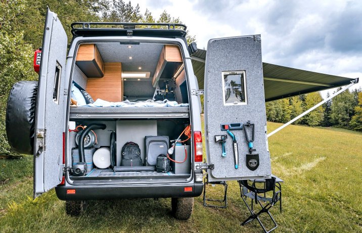 Budując własnego kampera lub zlecając jego stworzenie, można pomyśleć o rozwiązaniu zastosowanym przez firmę Adventure Van Conversions w jednym ze swoich projektów – całe skrzydło drzwiowe wykorzystano do mocowania segregatorów i uchwytów na drobne, a zarazem często używane przedmioty. Chodziło o funkcjonalność. Po otwarciu drzwi mamy do nich bardzo wygodny dostęp.