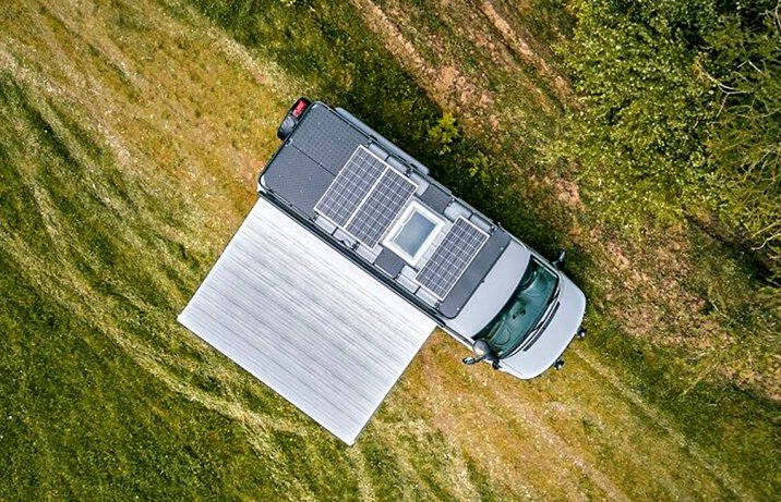 Markiza chroni przed słońcem i deszczem, przez co na swój sposób powiększa część „mieszkalną”. / adventurevanconversions.com