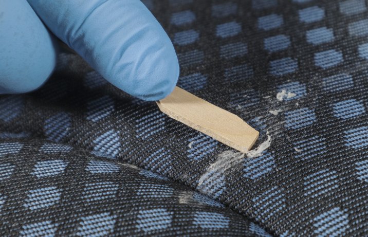 Po upewnieniu się, że preparat nie odbarwia tapicerki, przystąpiliśmy do usuwania gumy zgodnie z instrukcją znajdującą się na opakowaniu produktu. Pierwszym krokiem było zeskrobanie nadmiaru gumy za pomocą drewnianej szpatułki. Prowadząc szpatułkę w różnych kierunkach i układając ją pod różnymi kątami, udało się usunąć wierzchnią warstwę zabrudzenia. Reszta gumy do żucia pozostała wklejona w materiał.