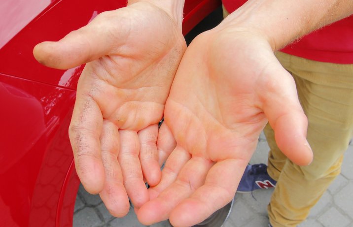 Na początku ręce zostały zabrudzone przepracowanym olejem silnikowym. Tego rodzaju brud jest tłusty, przez co trudno go usunąć podczas mycia.