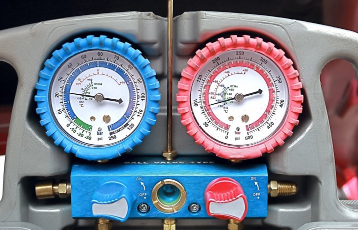 Sprawdzenie ciśnienia w układzie - na podstawie odczytów z manometrów (wyniki są specyficzne dla konkretnych modeli) serwisant ocenia, czy ilość czynnika chłodniczego w obiegu jest na dobrym poziomie.