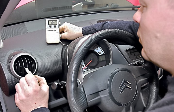 Pomiar temperatury w kratkach nawiewu: ocena skuteczności chłodzenia. Po ustawieniu na maksymalne chłodzenie, prawidłowe wartości odczytu sprawdza się w tabelach – zależą od temperatury i wilgotności powietrza.