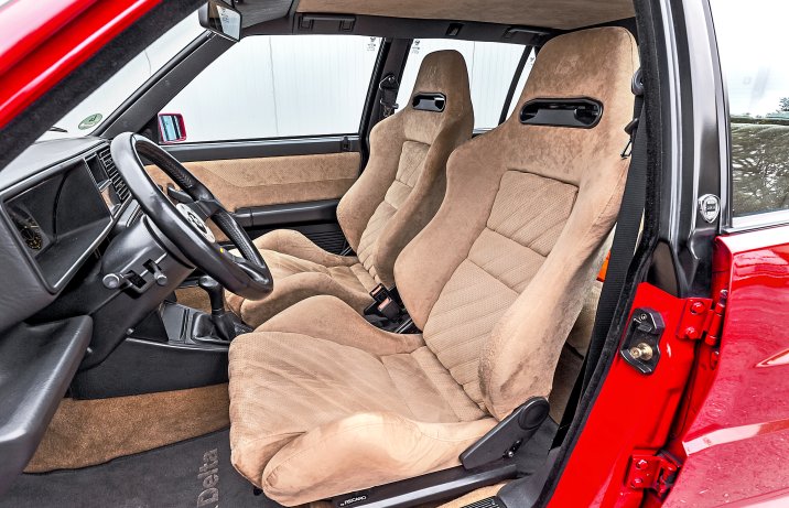 Sportowy charakter Delty Evo już z zewnątrz podkreślają grube „policzki” i wysunięty spojler dachowy. W nisko zamontowanych, wysokich fotelach Recaro można poczuć, dlaczego Delta odnosiła sukcesy w rajdach samochodowych.