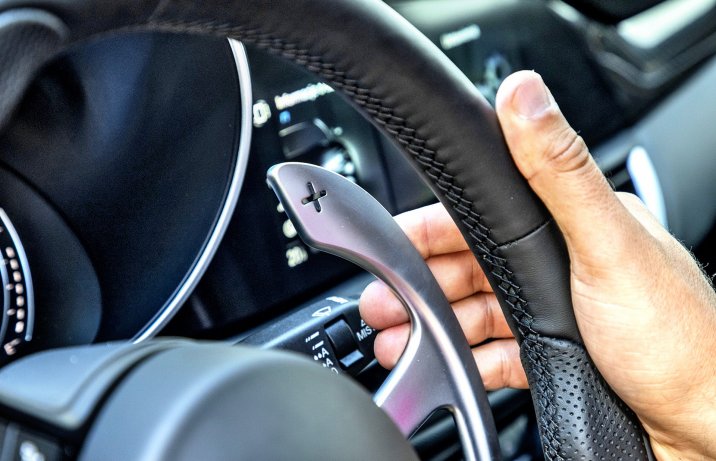 Za pomocą łopatek świetnego trybu ręcznego można przełączać skrzynię w pozycję N (ciągnąc obie do siebie) lub włączać tryb D (ciągnąc prawą).
