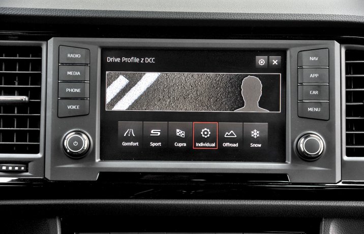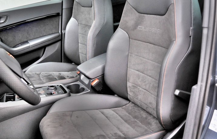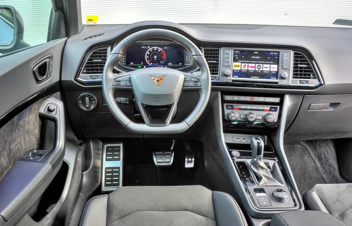Ładowność 518 kg też jest „godna”, a kanapa – dobrze wyprofilowana. Choć wysoki i szeroki tunel środkowy preferuje dwie osoby, docenią one zarówno rozkładany podłokietnik z wnękami na napoje, spore kieszenie w drzwiach i w fotelach, jak i dodatkowe nawiewy. Pod nimi umieszczono dwa USB do ładowania urządzeń multimedialnych oraz specjalną kieszeń, np. na smartfona. Tak, Cupra to bez dwóch zdań auto rodzinne.