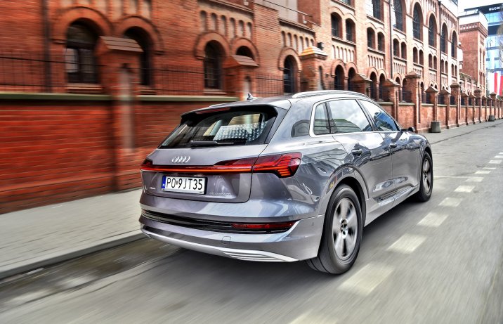 Z seryjnymi oponami o średnicy 19” i relatywnie dużym profilu (55) większość nierówności „rozpływa się” gdzieś w podwoziu. I tym właśnie ujmuje e-tron podczas jazdy – spokojem. Jego układ kierowniczy w środkowym położeniu nie zapewnia za wiele czucia, a przy skręcie lub zmianie obciążenia nadwozie nieco się przechyla. Daje o sobie znać także słuszna masa własna: testowany egzemplarz ważył 2596 kg (z czego 700 przypada na akumulatory). Oznacza to, że Audi nie powinno wjeżdżać na niektóre uliczki lub mosty.