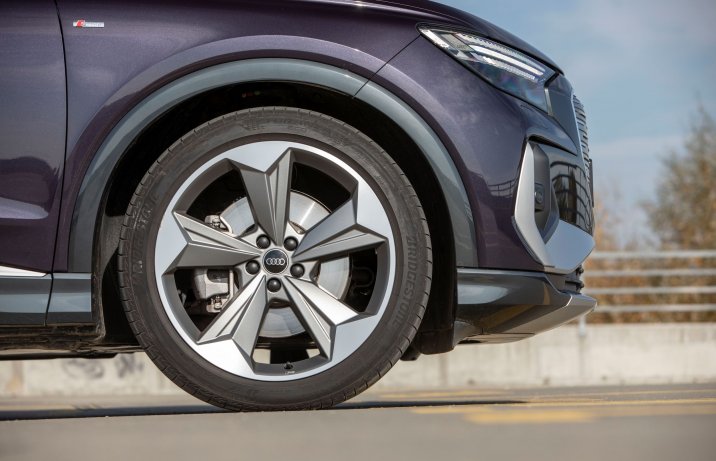 Q4 Sportback e-tron seryjnie ma felgi 19'', wersja S line „dwudziestki”, a testowane Audi aż 21-calowe.