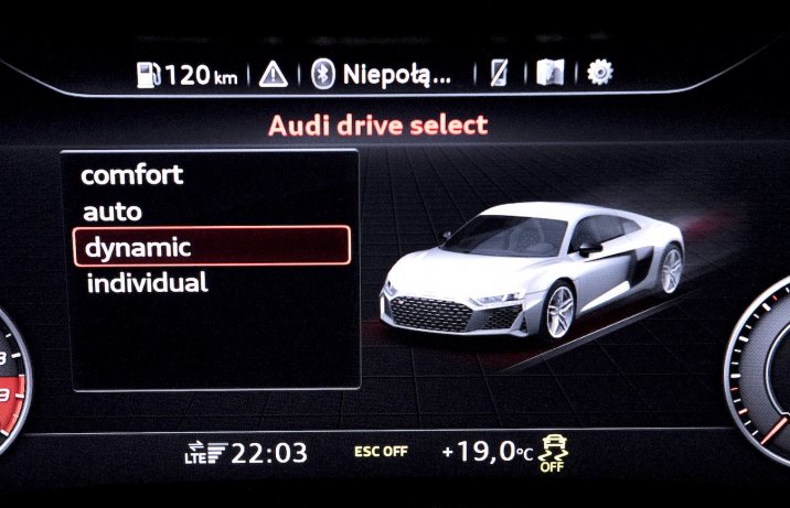 R8 nie rozpieszcza też przestrzenią ładunkową – pod sporą pokrywą kryje ledwie 112-litrowy bagażnik (do dyspozycji jest jeszcze miejsce za fotelami). Na tle innych supersamochodów nie są to jednak szczególne wyrzeczenia. Poza niezłym komfortem tłumienia nierówności i znośnym poziomem hałasu Audi punktuje przejrzystością obsługi oraz znakomitą jakością montażu. Na desce rozdzielczej nie ma centralnego ekranu – zegary i system operacyjny korzystają ze wspólnego wyświetlacza za kierownicą. W pierwszej chwili to połączenie może przytłaczać, ale wystarczy chwila przyzwyczajenia, by docenić wyśmienitą czytelność i rozliczne możliwości wyświetlania informacji.