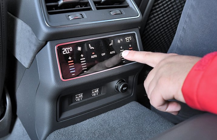 Sporo, choć nie rekordowo dużo miejsca na kanapie. Klimatyzacja 4-strefowa, obsługiwana za pomocą dotykowego panelu, to wyposażenie seryjne każdego RS 6.