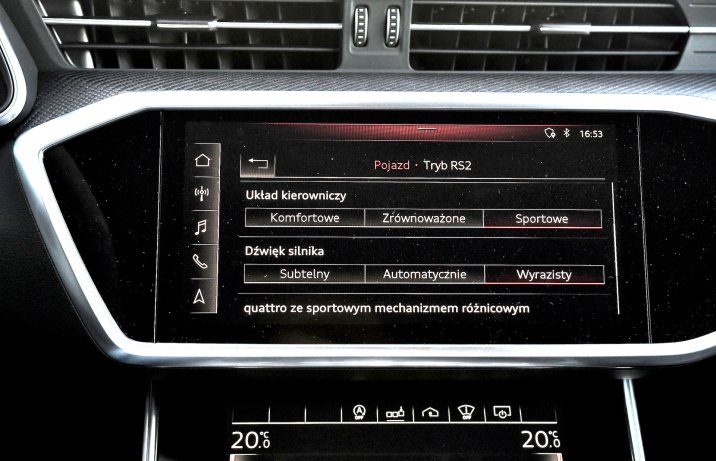 Wybór najbardziej sportowych ustawień (RS1 i RS2) m.in. wzmacnia dźwięk silnika, choć nadal nie gra on pierwszych skrzypiec, i wyostrza reakcje napędu. W końcu przy zmianie biegu blisko maksymalnych obrotów pojawia się lekkie szarpnięcie, a 8-stopniowy automat przestaje ingerować w poczynania kierowcy i w trybie ręcznym sam nie zmienia przełożeń. Do super-kombi spod znaku Audi nie pasuje jednak zbyt opieszała reakcja na kickdown w ustawieniu D, przez co np. wyprzedzanie nie zawsze odbywa się tak błyskawicznie, jakby można było tego oczekiwać po aucie o mocy 600 KM.