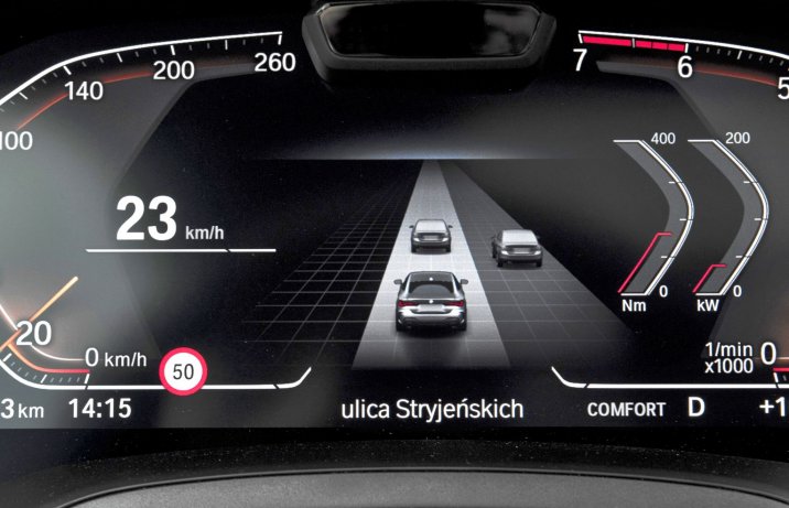 Na ekranie wskaźników można obserwować sytuację na drodze dookoła auta. „Czwórka” rozróżnia m.in. ciężarówki czy motocykle i pokazuje pozycję samochodu na pasie.