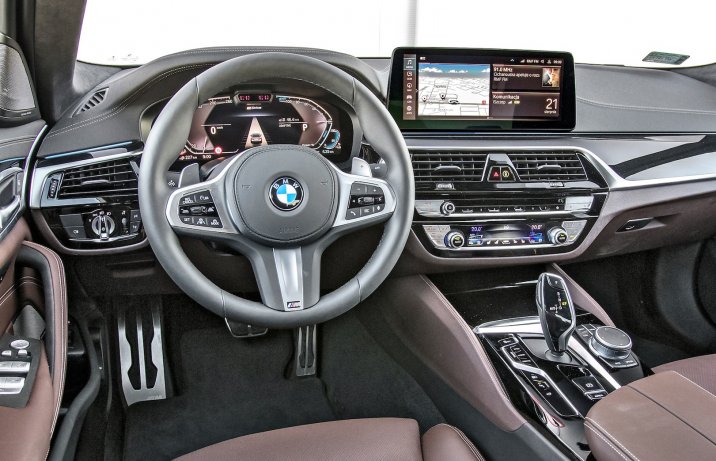 Wnętrze zmieniło się jeszcze mniej niż nadwozie – właściwie jedyną nowością jest powiększony ekran główny. Wcześniej seryjnie miał przekątną 8,8 cala, a opcjonalnie 10,25. Teraz już bazowo otrzymuje się ekran 10,25'', a za dopłatą – aż 12,3-calowy. Poza tym wnętrze serii 5 nie wymagało żadnych zmian.