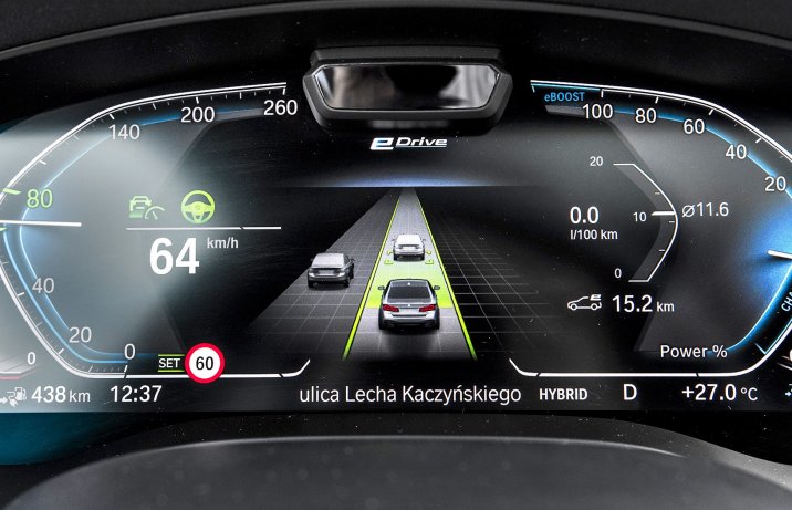 Ekran wskaźników prezentuje sytuację wokół auta – rozróżnia rowery czy ciężarówki i pokazuje pozycję auta względem środka pasa.
