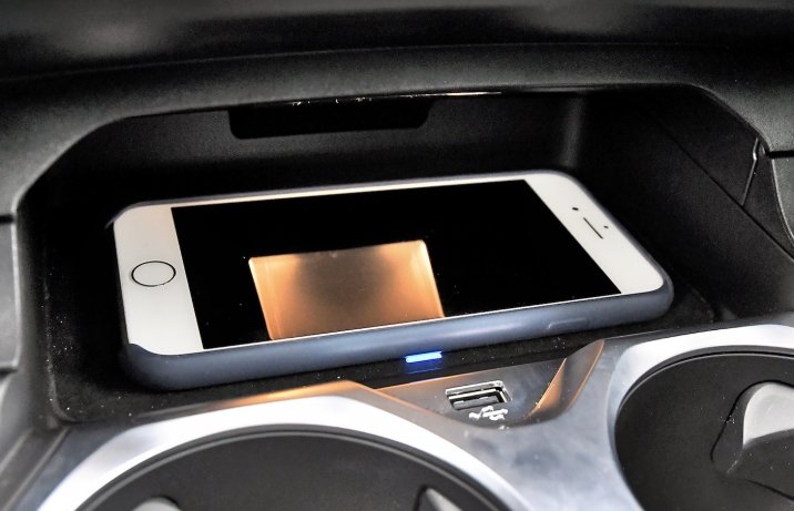 Ładowarka indukcyjna tuż pod ręką i „zwykły” port USB przy otworach na kubki (w kabinie są też gniazda USB-C).
