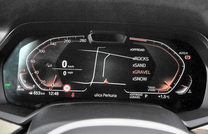 Wskaźniki LCD – efektowne, ale niezbyt czytelne – to nowość w X5. Tak jak widoczny po prawej wybór trybów terenowych.