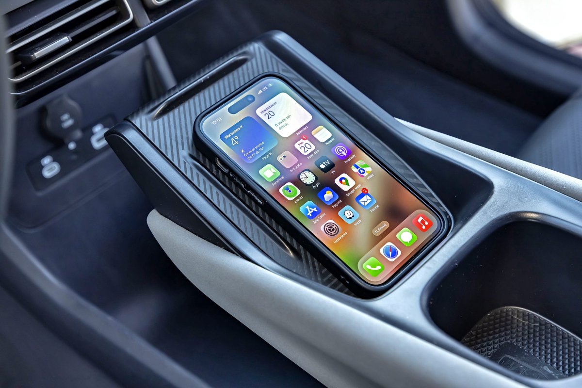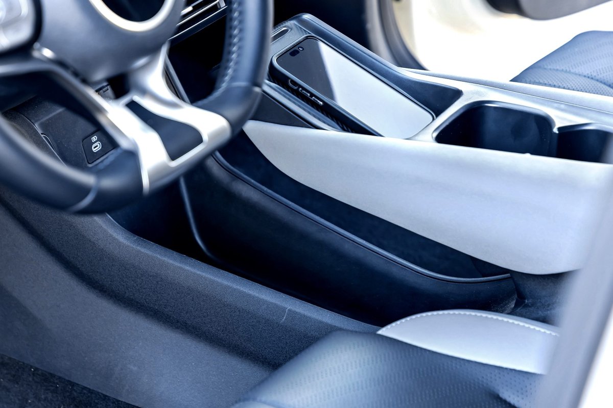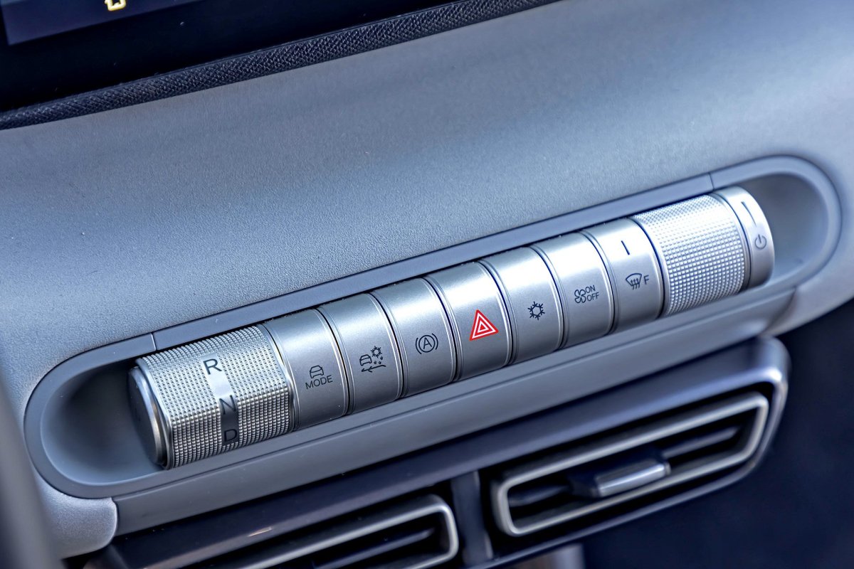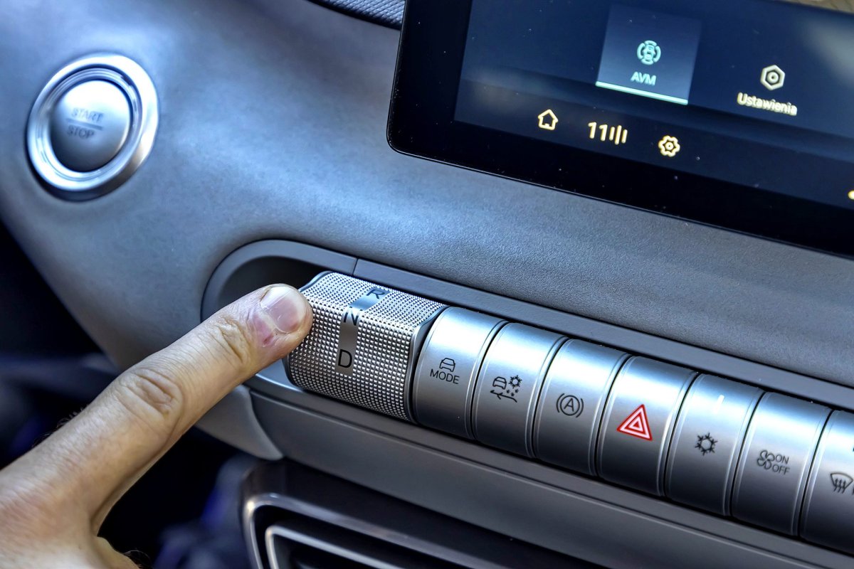 Ciekawie rozwiązano obsługę 1-biegowej przekładni. Do wyboru biegów służy okrągły przełącznik z niewielką wypustką, umieszczony pod centralnymi nawiewami. Obok niego znalazł się rząd przełączników o cylindrycznym kształcie. Wśród nich m.in. wyboru trybów jazdy, świateł awaryjnych czy odmrażania przedniej szyby. Reszta obsługi, łącznie z klimatyzacją, leży „w rękach” centralnego ekranu.
