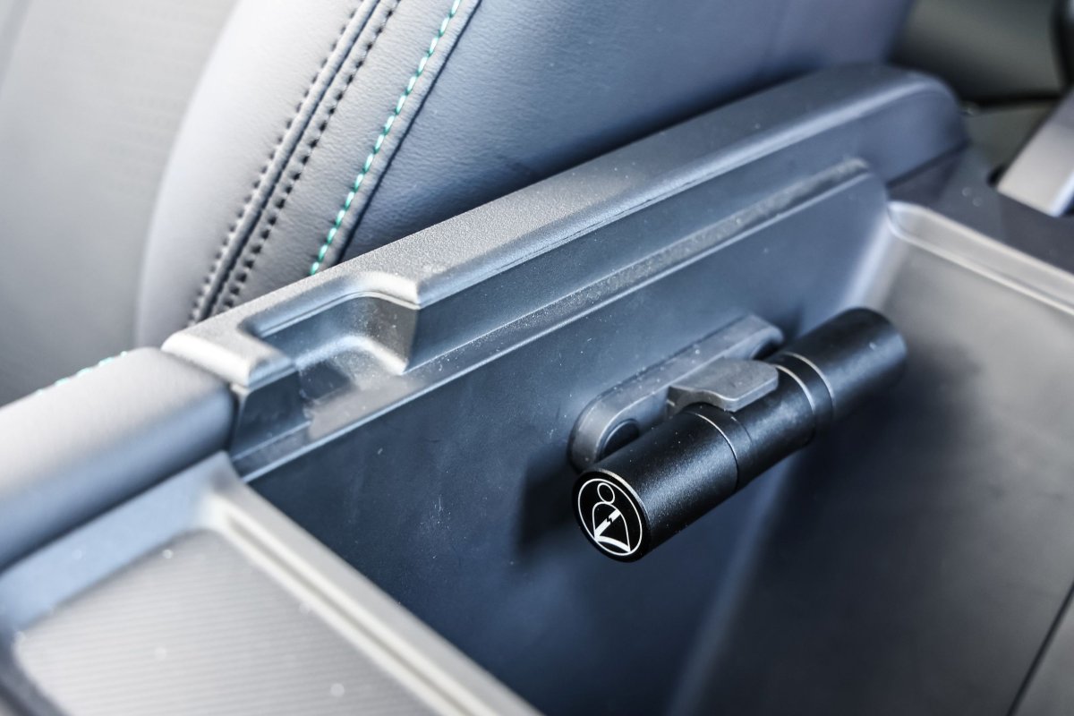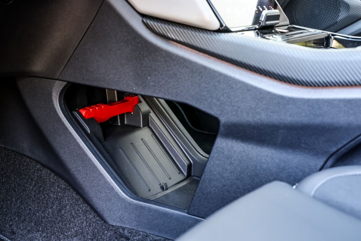 W schowku pod podłokietnikiem umieszczono przyrząd do zbijania szyb i przecinania pasów bezpieczeństwa. / fot. Daniela Loof/AZ