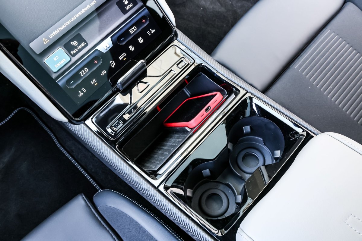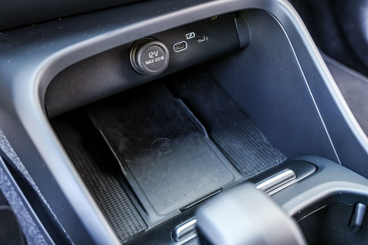 Ładowarka bezprzewodowa jest w szczelinie przed uchwytami na napoje. Lepiej, żeby się nie rozlały. / fot. Daniela Loof/AZ