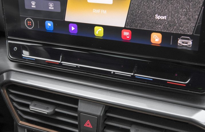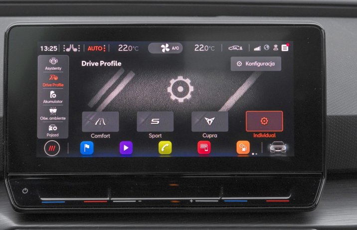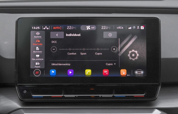 Temperaturę zmieniasz dotykowymi suwakami pod centralnym ekranem lub wywołując na nim odpowiednie menu. Owszem, po załadowaniu działa on już sprawnie, jednak ma liczne niewielkie ikony oraz poukrywane funkcjonalności, co po prostu rozprasza w czasie jazdy. Ale Cupra na tle zwykłego Leona wykazuje jedną przewagę. Otóż tutaj do zmiany trybów jazdy służy przycisk przymocowany do kierownicy, dzięki czemu nie musisz szukać ustawień na centralnym ekranie.