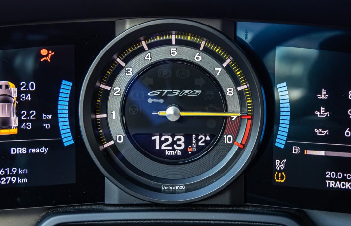 W GT3 RS moment obrotowy i moc nie są po prostu dostępne, lecz zachwycają, a do tego osiągają wartości maksymalne w szerokim zakresie obrotów. Dopiero przy 8500 obr./min układ napędowy pracuje z pełną mocą – prędkość maksymalna to 9000 obr/min. System jest dostrojony do tego momentu. Przełożenia skrzyni i prędkość obrotowa są wówczas idealnie dopasowane. Moc 131 KM na litr pojemności to szczyt możliwości silnika wolnossącego.