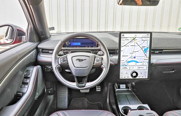 Za pomocą dotykowego wyświetlacza możemy wybrać tu różne konfiguracje pracy napędu. Poza trybami jazdy o niespotykanych nazwach (Whisper, Active i Untamed, czyli w wolnym tłumaczeniu z języka angielskiego: Szept, Aktywność i Nieokiełznanie) jest jeszcze jeden dodatkowy, pozwalający na jazdę przy użyciu wyłącznie pedału gazu. Korzystając z rekuperacji, Mustang wytraca wtedy prędkość tak skutecznie, że w ruchu miejskim w zasadzie nie trzeba korzystać z hamulca.