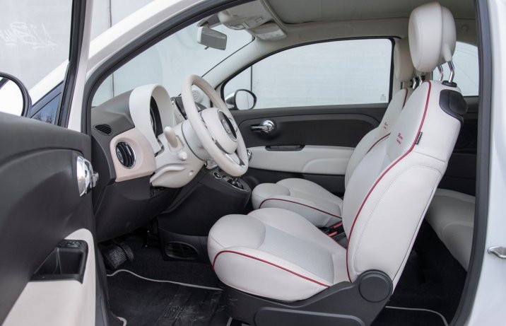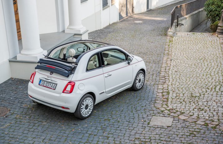 Odmiana Dolcevita z zewnątrz wyróżnia się m.in. kolorem Biały Gelato, dwiema cienkimi czerwonymi liniami biegnącymi dookoła nadwozia oraz chromowanymi lusterkami i listwą na masce. A w opisywanym wariancie z otwieranym dachem – także charakterystycznym poszyciem dachowym w biało-niebieskie pasy, nawiązującym do klasycznego sprzętu plażowego: leżaków, koszy, parasoli czy parawanów.