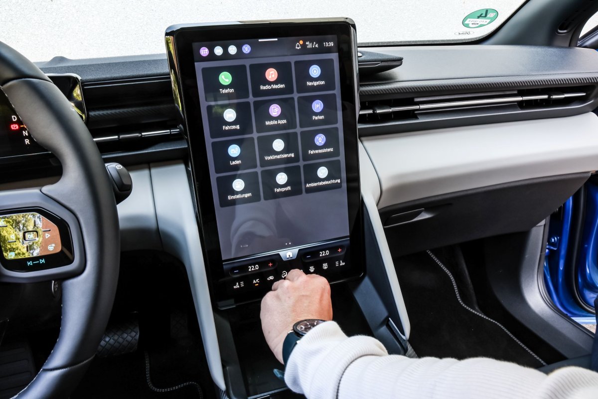 Kanciasta kierownica i pionowo ustawiony ekran z regulacją kąta nachylenia. Daszek nad nim i wskaźnikami to soundbar. / fot. Daniela Loof/AZ