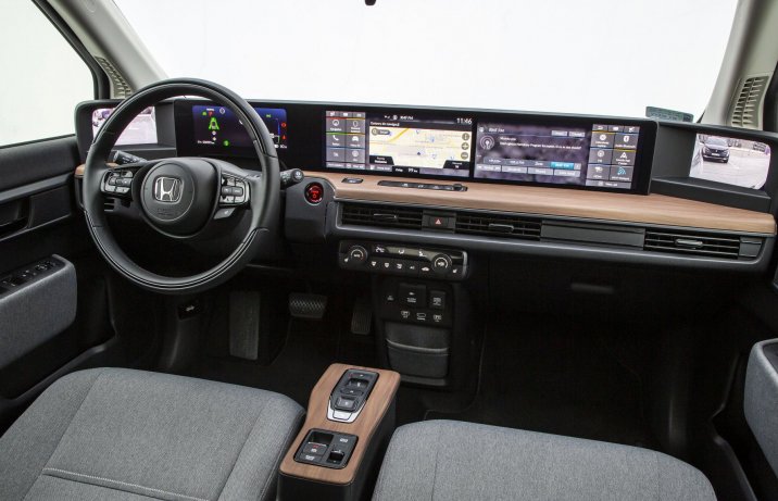 Futurystyczna, ale ergonomicznie rozplanowana deska rozdzielcza Hondy e nie zabiera przestrzeni w kabinie. Porządne ekrany i wysoka jakość montażu.