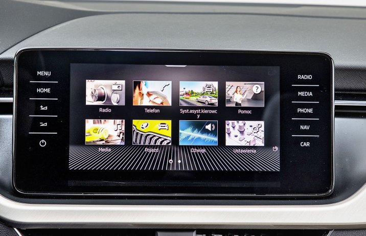 Uporządkowany kokpit Skody. Seryjny ekran ma 8 cali, 9,2-calowy z nawigacją: 4050 zł (5600 zł także z cyfrowymi zegarami).