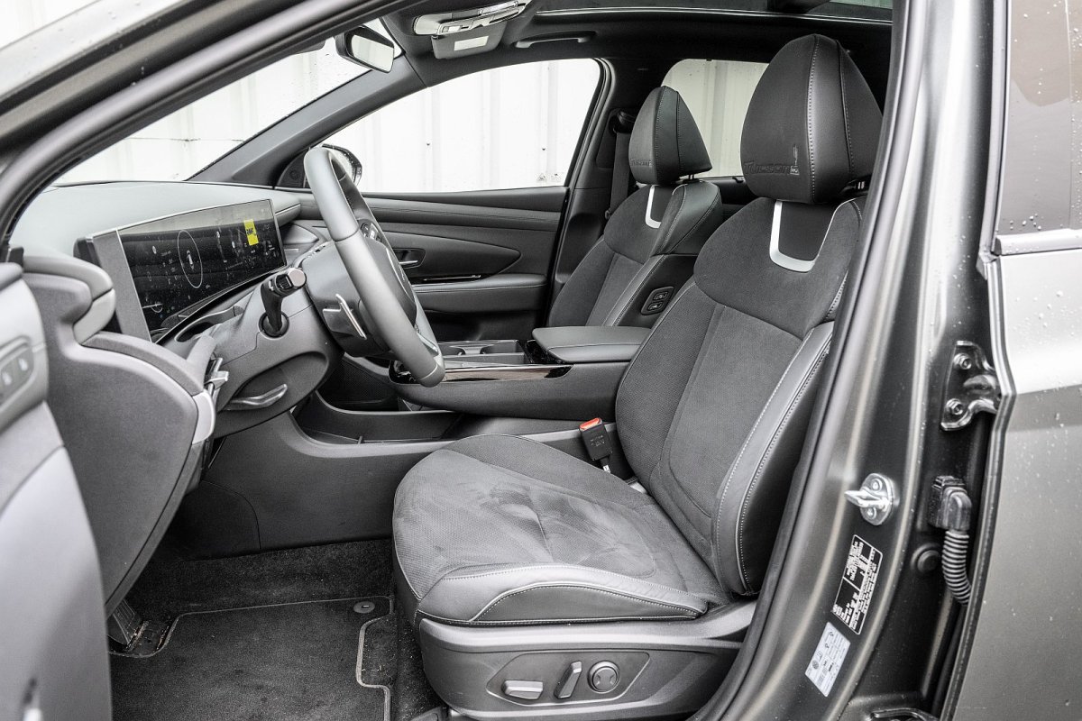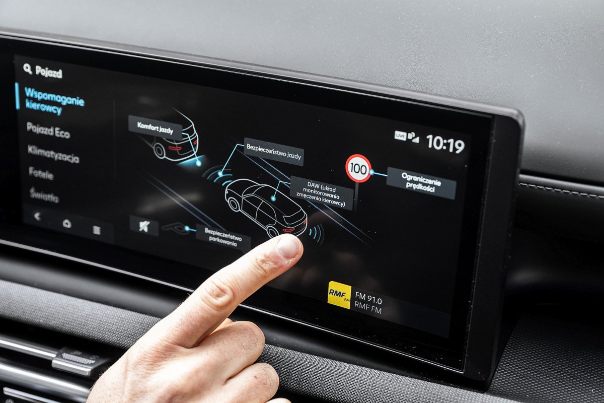 Tucson po liftingu otrzymał zupełnie nową deskę rozdzielczą, która łączy dwa wspólnie zgrupowane ekrany z osobnym panelem regulacji wentylacji oraz „wolnostojącą” konsolą środkową z ładowarką smartfona oraz klasycznymi przyciskami. Kokpit ma ergonomiczną architekturę – sięganie do ekranu nie wymaga odrywania pleców od oparcia, a obsługa nawiewu okazuje się wyjątkowo intuicyjna, zwłaszcza na tle obecnych standardów. Plus za szybkie reakcje dotykowego ekranu i uporządkowane menu oraz trzystopniową regulację intensywności automatycznej klimatyzacji.