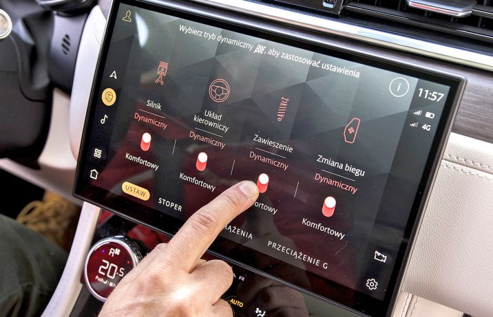 Z perspektywy kierowcy F-Pace ma wiele zalet, w tym: wszechstronnie konfigurowalne cyfrowe zegary z możliwością prezentacji mapy, sporo analogowych instrumentów (m.in. pokrętło do regulacji podświetlenia) oraz przejrzysty, estetyczny system operacyjny. Ale są i wady: „szklane” przyciski na kierownicy oraz panelu wentylacji nie są zbyt precyzyjne w reakcjach, nawiew pracuje nieco za głośno, poza tym brakuje obsługi głosowej po polsku.