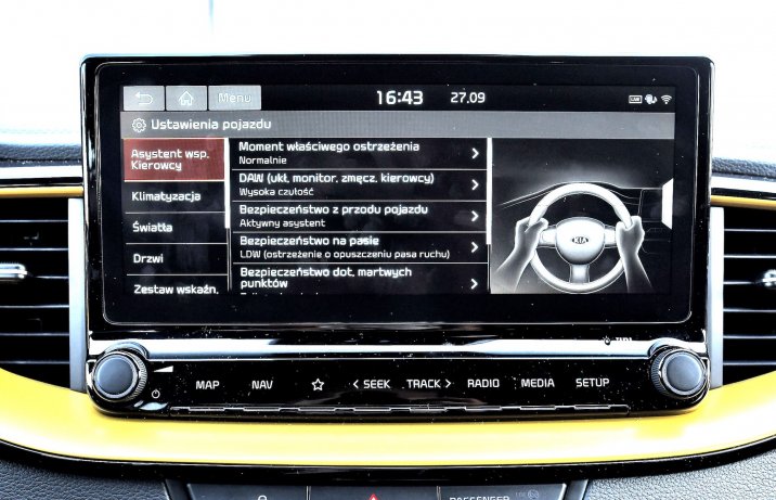 Ergonomia jest absolutnie bez zarzutu, nie brakuje schowków (szkoda, że ten przed pasażerem nie został miękko wyściełany) i półek, a układ wentylacji nigdy nie pracuje za głośno. Kia pozostawiła fizyczną regulację podświetlenia kokpitu i panel z włącznikami podstawowych systemów wspomagania kierowcy – i chwała jej za to.