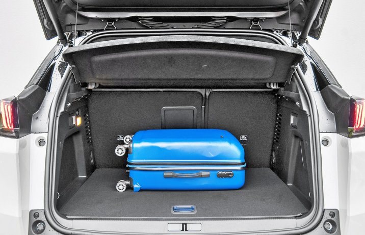 3008 może mieć napęd jak w Citroenie, ale w teście jest mocniejsza wersja 4x4, z dodatkowym silnikiem elektrycznym z tyłu. Ładowanie baterii (13,2 kWh) trwa ok. 4-7 godzin, ładowarka 7,4 kW (1500 zł) może skrócić je do 2 godzin.
