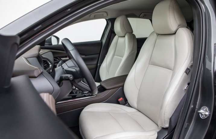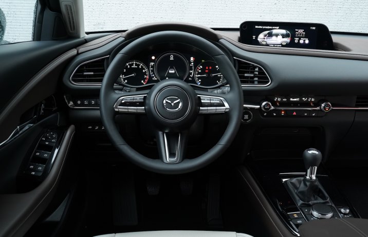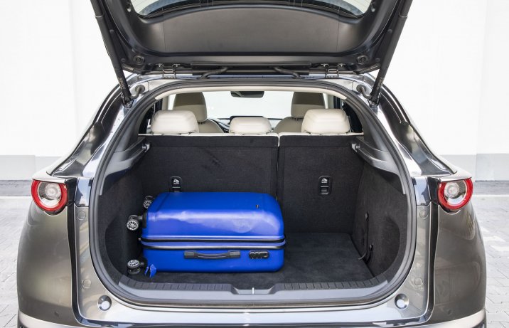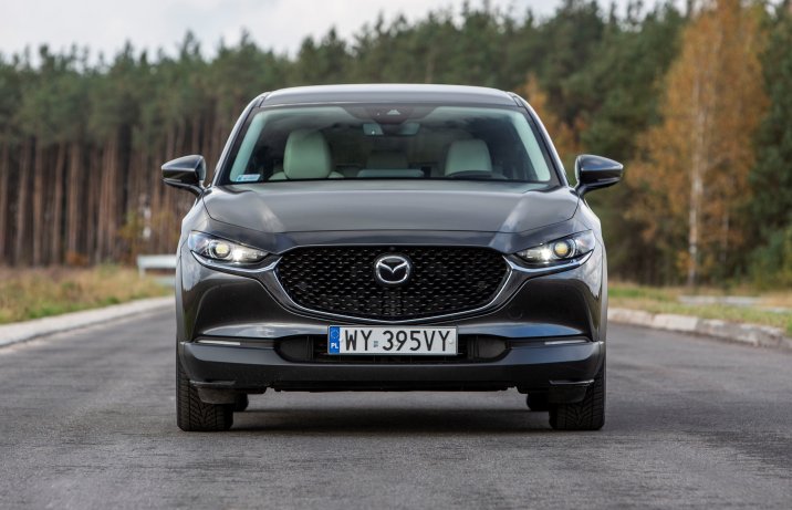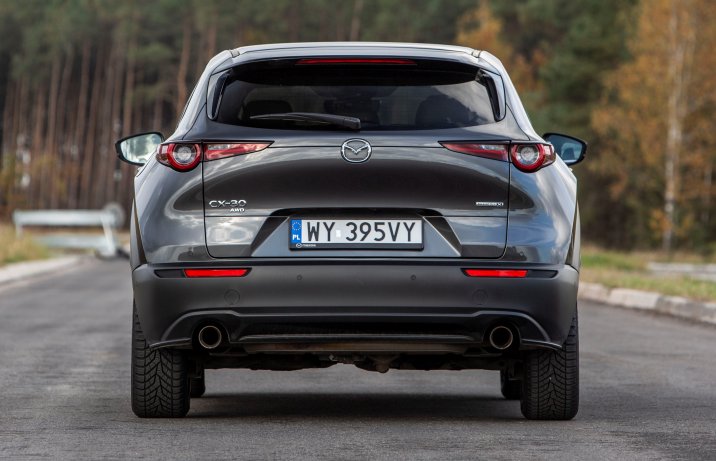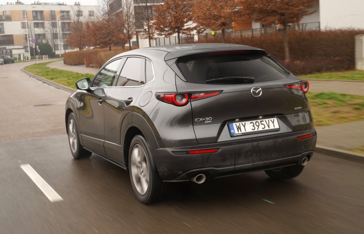 Samochód został zbudowany na płycie podłogowej Mazdy 3. Siedzi się nieco wyżej niż w kompakcie z Hiroszimy, ale nie tak jak w innych SUV-ach. Na tle klasycznych reprezentantów tego segmentu 1,54-metrowa CX-30 jest dosyć niska, co sprawia także, że do kabiny wsiada się mniej swobodnie niż do modeli z bardziej pudełkowatym nadwoziem. Skojarzenia ze zwykłym hatchbackiem wzbudza także nachylenie tylnej szyby. Poprawia wygląd samochodu, ale nieco ogranicza kubaturę wnętrza. Nie można jednak powiedzieć, że miejsca jest zbyt mało. Z przodu przestrzeni jest wystarczająco dużo, z tyłu mogą podróżować dwie dorosłe osoby, a bagażnik mieści 430 l (lub 422 l w autach z opcjonalnym nagłośnieniem Bose). Do pełni szczęścia zabrakło dłuższych siedzisk foteli.