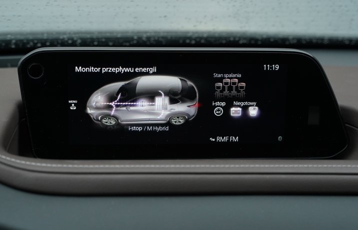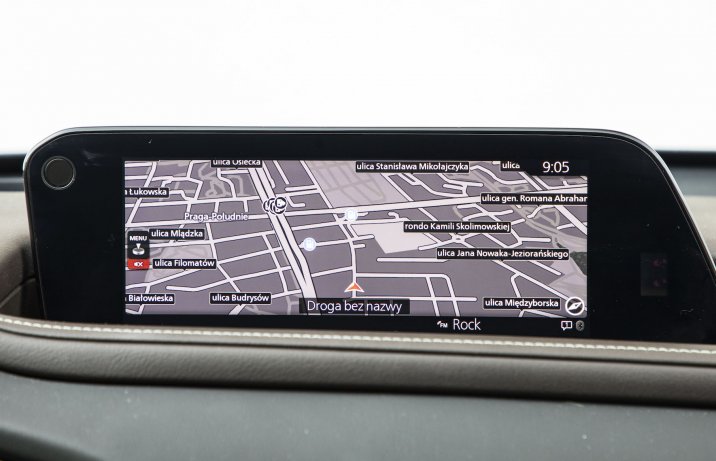 W kabinie CX-30 panuje typowy dla Mazdy porządek i minimalizm. Pracujące z przyjemnym kliknięciem przyciski, delikatne metalizowane wstawki czy skórzane obszycia sprawiają, że wnętrze robi znacznie lepsze wrażenie niż w modelach popularnych marek. Takiego wykończenia nie powstydziłyby się także mniejsze SUV-y z półki premium, zwłaszcza w mniej obficie skonfigurowanych wersjach. Większość pokładowych urządzeń obsługuje się intuicyjnie. W przeciwieństwie do rywali istotne funkcje, nawet regulacja podświetlenia kokpitu, mają fizyczne przyciski sterujące. Niczego nie trzeba więc szukać w kolejnych zakładach systemu multimedialnego. Za jego pomocą można natomiast skonfigurować sposób działania wielu elementów, z czułością systemów wsparcia kierowcy włącznie. Centralny ekran nie jest dotykowy. Stacją multimedialną zawiaduje się pokrętłem obłożonym przyciskami skrótu. Wszystko jest łatwe w obsłudze i w miarę intuicyjne. Konkurenci w zakresie elektroniki mają jednak więcej do powiedzenia.