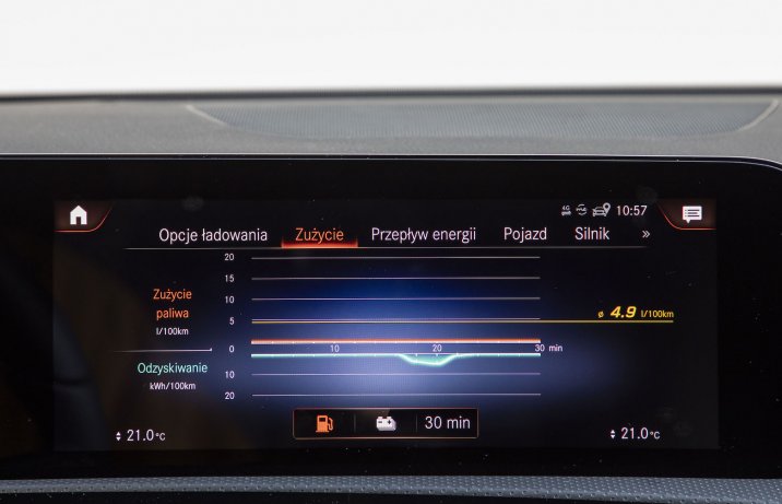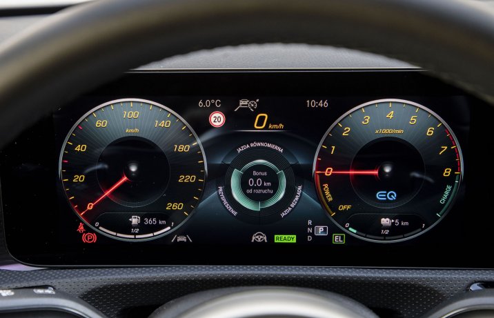 W trybie elektrycznym rekuperacja jest jeszcze bardziej zaawansowana. Domyślnie mamy ustawioną ją w trybie automatycznym, jednak łopatkami za kierownicą można nią także sterować ręcznie. Ukryty w tylnej części nadwozia litowo-jonowy akumulator o pojemności 15,6 kWh można ładować prądem z domowego gniazdka, wallboxa lub miejskich stacji. W teorii wystarcza to na pokonanie do 74-77 km (mierzone według cyklu NEDC) bez zużywania kropli paliwa. W praktyce zasięg na prądzie jest niższy (zbliżony do 61-69 km według cyklu WLTP), co jednak dalej wystarcza, by przy regularnym ładowaniu ogniw na co dzień można było jeździć klasą jak samochodem elektrycznym. Co istotne, nawet zimą realny zasięg pozostaje na tyle duży, że wciąż wystarcza, by przy regularnym ładowaniu akumulatora A 250 e zachowywało się jak miejskie auto elektryczne.