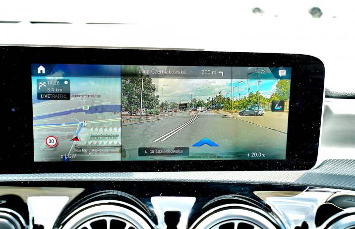 System inforozrywki Mercedesa ma dość rozbudowane, wielopoziomowe menu, ale jest logicznie poukładany. Można go „okiełznać” aż na 4 sposoby: z kierownicy, gładzikiem w konsoli, przez ekran lub głosowo. Trzeba tylko poświęcić chwilę na dopasowanie czułości dotykowych paneli do swoich preferencji. Obsługa głosowa działa wyjątkowo skutecznie – potrafi za pierwszym razem rozpoznać nawet złożone adresy.