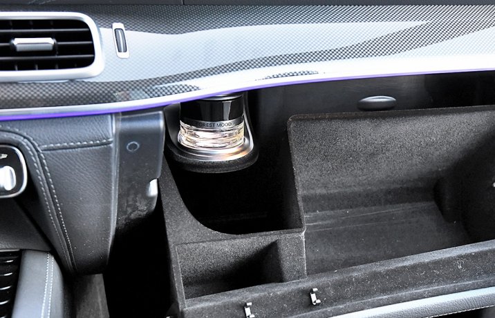 Duży, tapicerowany schowek przed pasażerem mieści też flakon opcjonalnego systemu aromatyzacji kabiny.