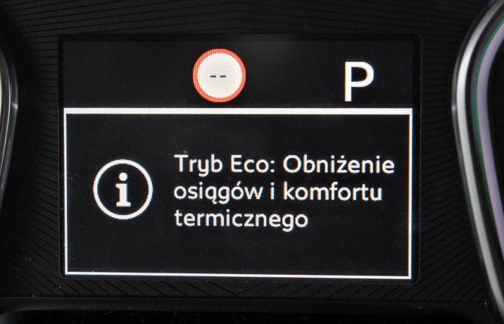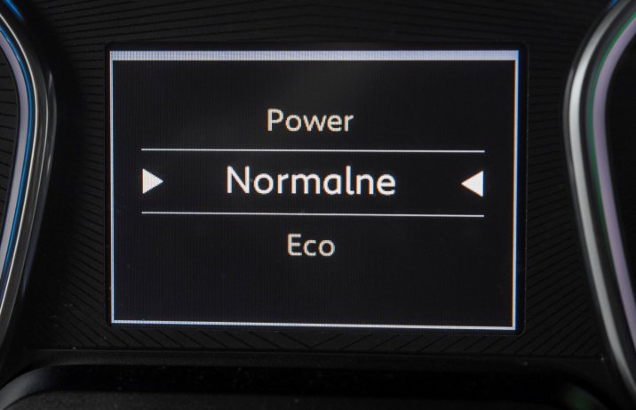 Do wyboru są trzy tryby jazdy różniące się parametrami uzyskiwanymi przez silnik: power (136 KM, 260 Nm), normal (109 KM, 210 Nm) oraz eco (82 KM, 190 Nm). W tym ostatnim zauważalnie pogarszają się osiągi i spada wydajność ogrzewania (w zimie poniżej poziomu, który można by uznać za pełen komfort termiczny), ale w zamian za to zmniejsza się nieco zużycie energii, a co za tym idzie – wzrasta zasięg.