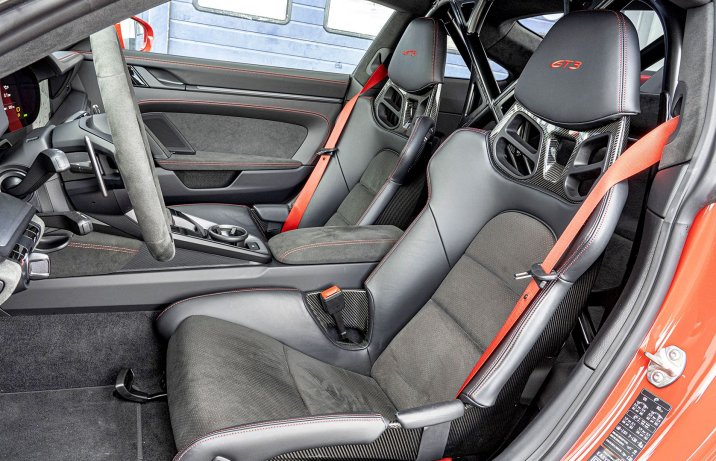 Bardzo wygodne fotele kubełkowe ze szkieletem wykonanym z włókna węglowego oraz z masywną klatka bezpieczeństwa z tyłu zamiast siedzeń należą do pakietu Clubsport w cenie 27 546 zł.