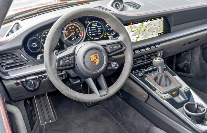 Kokpit, poza wykończeniem Alcantarą kierownicy, lewarka zmiany biegów i poduszki dla kolana kierowcy – praktycznie jak w innych „911”. Solidne spasowanie, czytelne zegary.