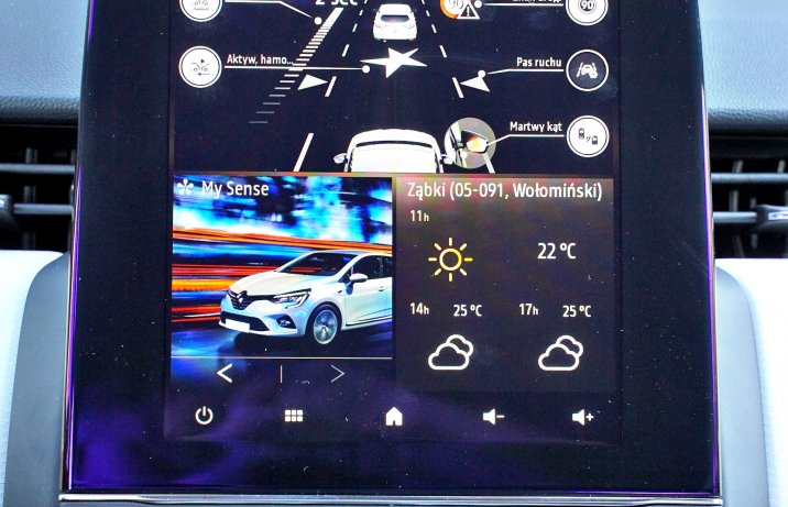 Ma błyszczącą powierzchnię, szybko reaguje na dotyk, ładna jest też sama grafika. Obsługa multimediów i bardziej zaawansowanych funkcji auta okazuje się bardzo prosta, a dodatkowe ułatwienie stanowi możliwość ustawienia na kilku „pulpitach” skrótów-widgetów. Testowe Clio ma częściowo cyfrowe, 7-calowe wskaźniki (zwykłe nadal pokazują poziom paliwa i temperaturę silnika). Będzie też oferowana wersja 10-calowa, na której może być wyświetlana mapa (na razie nie ma jej wśród opcji).