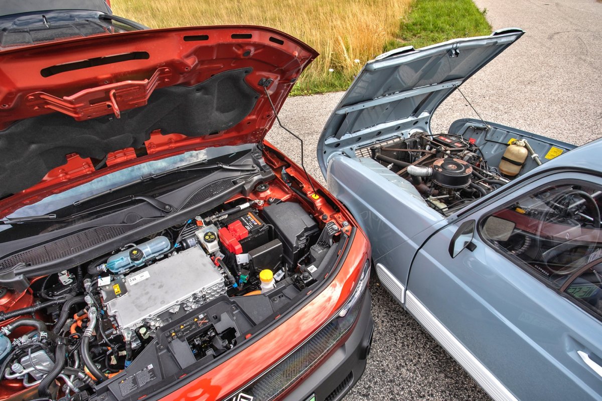 Zmiana totalna: kiedyś – silniczek R4 o poj. 0,6-1,3 l i 3-4 biegi, teraz – bezgłośna jednostka elektryczna i automat.