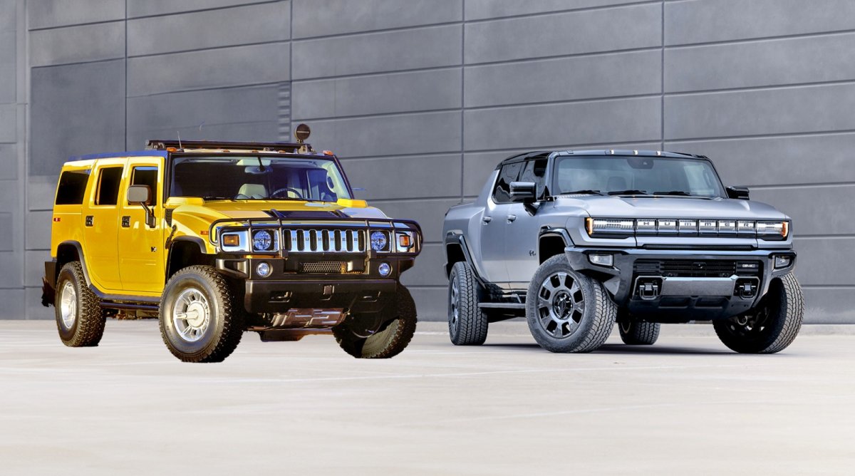 Hummer EV, dostępny jako SUV (5 m dł.) oraz pikap (5,5 m dł.) nawiązuje do spalinowych Hummerów z lat 90. oraz 2000.; marka ta, kupiona przez koncern General Motors w 1998 r., przetrwała do 2010 r., gdy została wycofana z powodu kryzysu finansowego. W tym czasie wypuściła na rynek trzy modele: H1, opartego na pojeździe wojskowym Humvee, oraz całkowicie cywilne H2 (fot.) i H3. Elektryczny Hummer osiąga nawet ponad 1000 KM i waży przeszło 4 tony. W 2024 r. Amerykanie kupili ponad 13 tys. egzemplarzy.