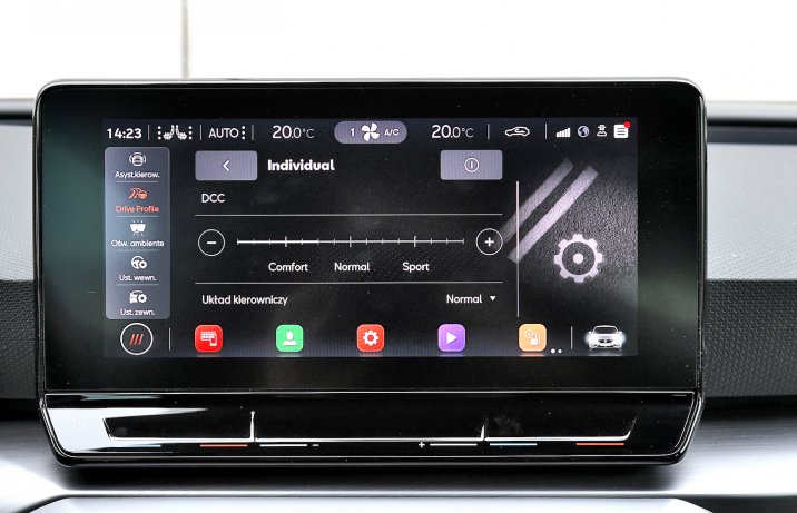 Zawieszenie ma aż 15-stopniową regulację twardości. Na górze ekranu zawsze jest pasek klimatyzacji, a przyciski szybkiego dostępu w dolnej części można niemal dowolnie konfigurować.
