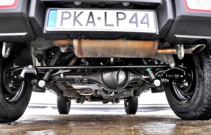 Pod spodem – jak przystało na „terenówkę” – rama oraz sztywne osie. Przedni most jest 21 cm od nawierzchni, tylny – 20,5 cm.