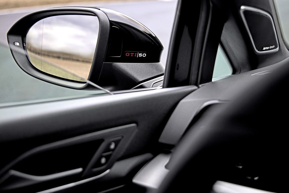 Napis „GTI | 50” wylądował nawet na bocznych lusterkach. Są przytwierdzone do drzwi i odsunięte od narożników, co pozytywnie wpływa na widoczność. / fot. Volkswagen