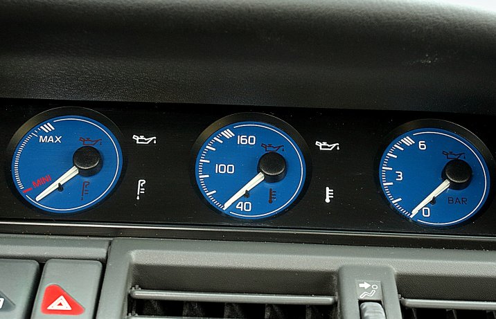 Od lewej: temperatura oleju i cieczy chłodzącej oraz ciśnienie oleju. Wszystkie wskaźniki na niebieskim tle. Ten kolor przewija się w całym wnętrzu wersji Williams.