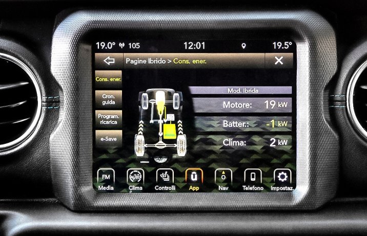 Aplikacja w systemie Wranglera 4xe pozwala na bieżąco śledzić działanie napędu hybrydowego i przepływ energii.