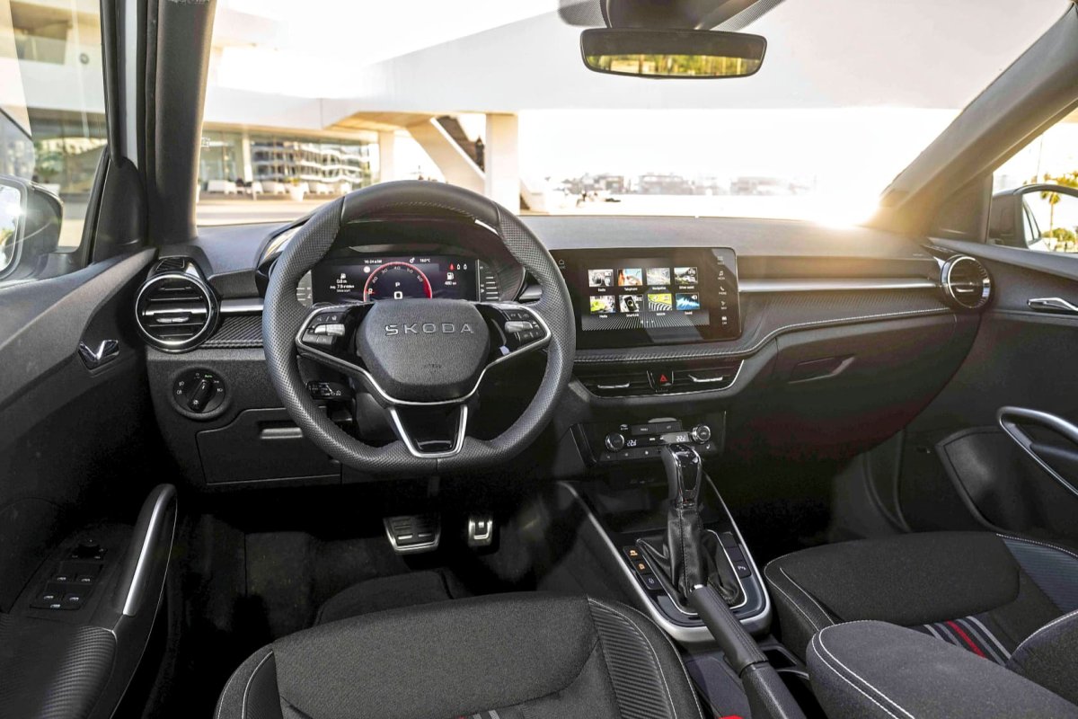 Komfortowa kabina z trójramienną sportową kierownicą i 8-calowym ekranem systemu multimediów. / fot. Skoda